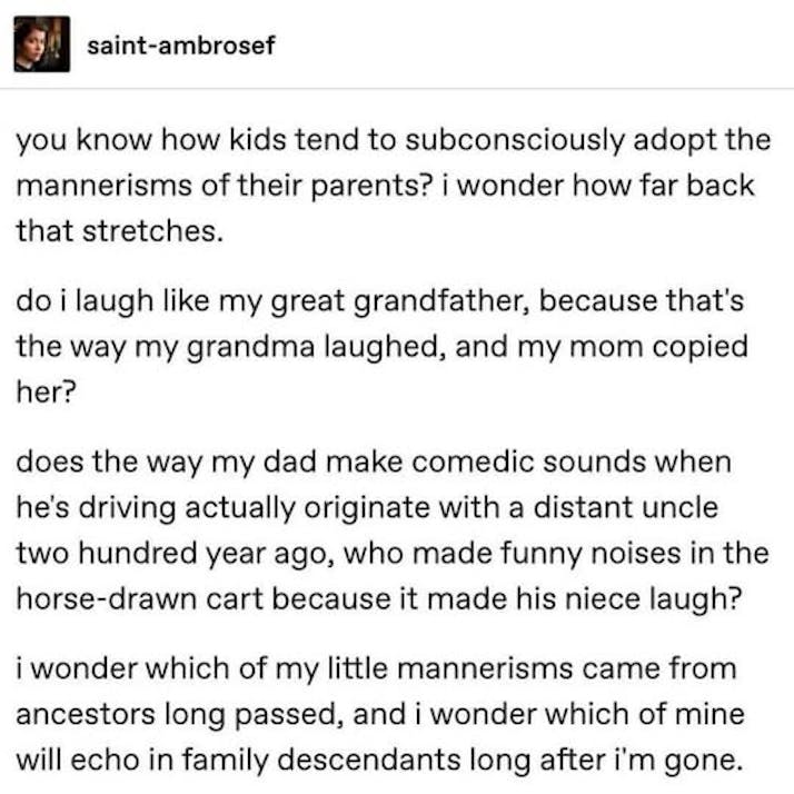 If you met your great, great, grandpa, would you have the same mannerisms? Are you cautious because your mom's - mom's - mom's - mom was? Maybe?