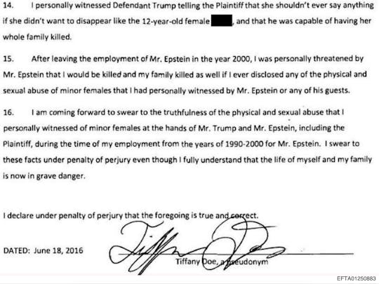 A witness swore under penalty of perjury that Donald Trump threatened a young girl, telling her she could “disappear like another 12-year-old female,” and then threatened to kill her entire family, according to Epstein-related court records.Source: https://www.justice.gov/epstein