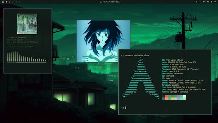 I said I would post on here more if @speedmaster removed all the linuxeasy spam and he has so here is a desktop thread, please post yours in the comments! My setup is Semi-Stock Omarchy 3.3.2 Forest Green ThemeKew music playerNothing super crazy but it looks pretty nice, post you