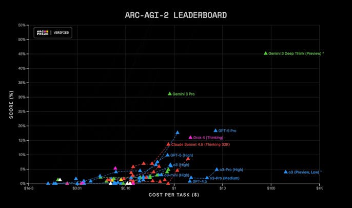 Gemini 3 models from @Google @GoogleDeepMind have made a significant 2X SOTA jump on ARC-AGI-2 (Semi-Private Eval)