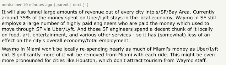 Interesting Hacker News comment that Waymo fares basically pull the money out of the local city