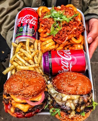 Spanish "poutine": gooey melted cheese, perfectly baked bacon, spicy beef, buttery shrimp - served with a tall glass of Brio chinotto π