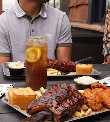 Sample platters featuring ribs, fries, chicken wings, coleslaw, and cornbread loaves - but the star of the show is the freshly brewed iced tea with lemon slices, or what is "sweet tea" in some places... which doesn't make sense since, if you're drinking your tea hot - but have pu
