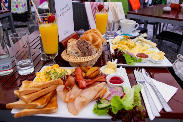 Casual brunch in the Austrian Alps: scrambled eggs, a generous stack of toast, bacon, shaved turkey, chonky fried potatoes, vegetables for colour - served with sparkling orange juice, and basket of non-commercial bread (you know... real bread without 27 ingredients)