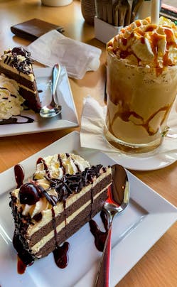 Chocolate & Mocha layer cake, topped with whipped cream and sprinkles - and brandied cherry... served alongside a salted caramel frappe π