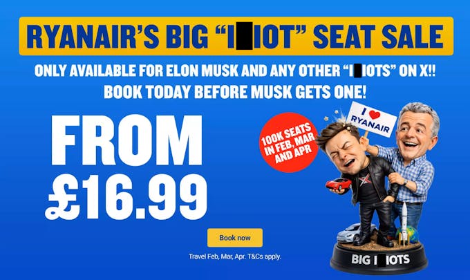 /airlinesJan 21stRyanair Big "I*iot" sale - dispute over Elon Musks commentshttps://www.ryanair.com/gb/en/lp/promotion/flash-sale