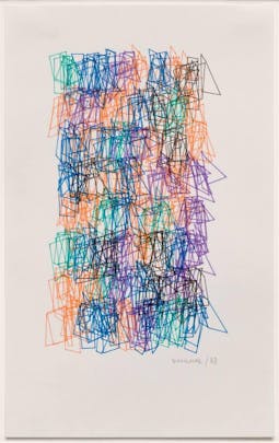 created from a plotter drawing produced using a computer program/algorithm written by Frieder Nake. An example of generative art created during a time where computers didn't have screens.