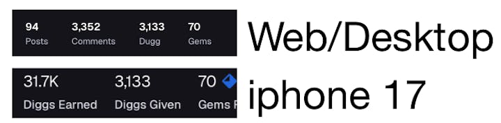 The profile view on web vs. mobile app have different information. On web / desktop, it does not show diggs earned. It does show that info if I mouse over someone's name on a post. It shows these on the profile: number Posts, Comments, Dugg, Gems On mobile (iphone) when I