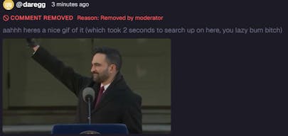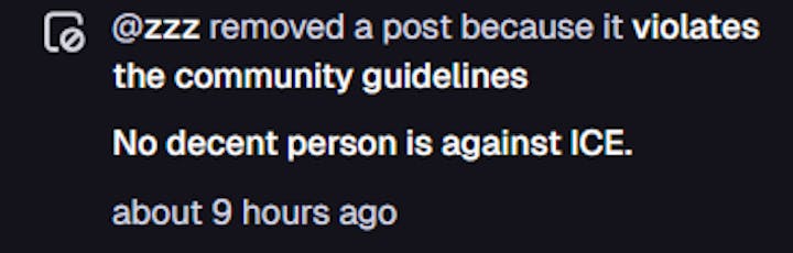 This is an ADMIN censoring a mundane rightwing viewpoint on a general community /politics. This site is just going to be another Reddit echo-chamber clone. RIP. The Bluesky of Reddit lmfao
