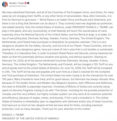 BREAKING: President Trump announces a 10% tariff on Denmark, Norway, Sweden, France, Germany, the UK, Netherlands, and Finland beginning February 1st. This tariff will be increased to 25% beginning on June 1st.