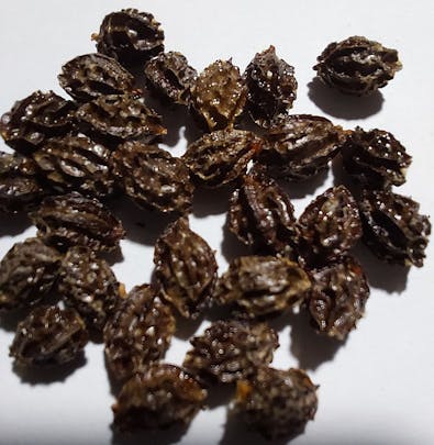 These aren't raisins; this is a close-up photo of papaya seeds. They can be ground up and used like a spice. The flavor is very similar to nasturtiums.