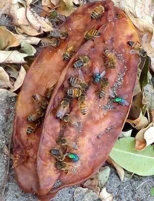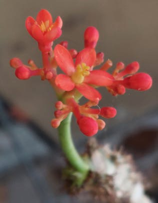 This species blooms sporadically year-round, even during the winter when the caudex is entirely leafless. The center flower in the photo is female. The flower in the upper left, and all of the remaining buds, are male.
