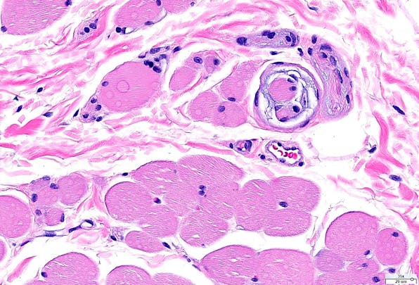 A photomicrograph of the skeletal muscle organ that prevents your biceps from shredding apart when you attempt to lift an automobile by the bumper. The stain is usual hematoxylin/eosin, the most common differential stain used in surgical pathology.