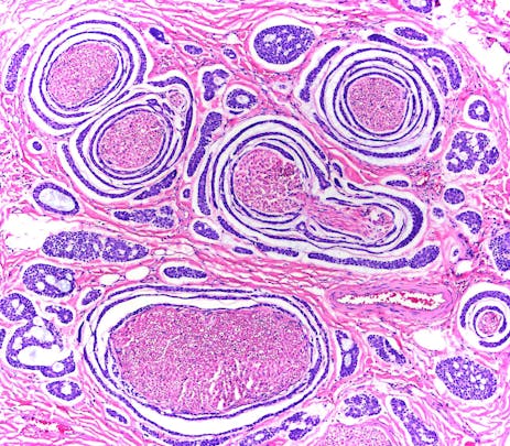 This histologic section features prominent perineural invasion, one way many neoplasms are able to "spread."