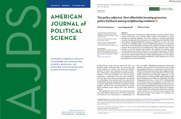 "While scholars have documented feedback effects among a policy's direct winners and losers, less is known about whether such effects can occur among the indirectly affected—“the policy adjacent.” Using 458 geocoded housing developments built between two nearly identical statewid