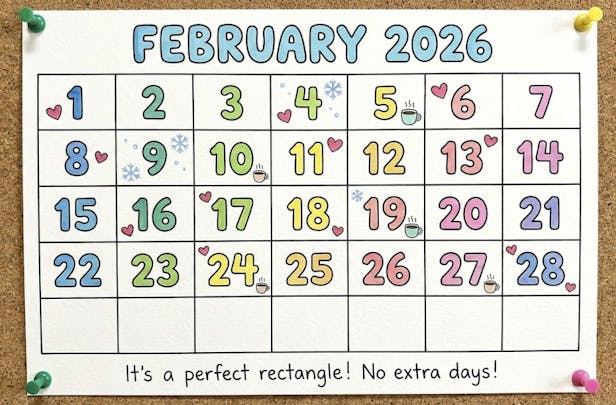 February 2026 is a perfect calendar month. Because 2026 isn't a leap year and Feburary 1st falls on a Sunday, the entire month fits into an exact 4x7 grid without any overhanging days from the previous or next month.
