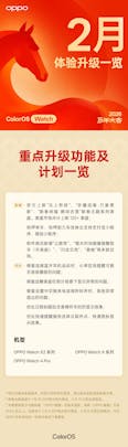 Based on the provided images, here is the summary of the ColorOS Watch February 2026 Experience Upgrade. This update introduces Lunar New Year themes, new applications, and various system optimizations. New Features & Content New Year Watch Faces: A new series of official "Year
