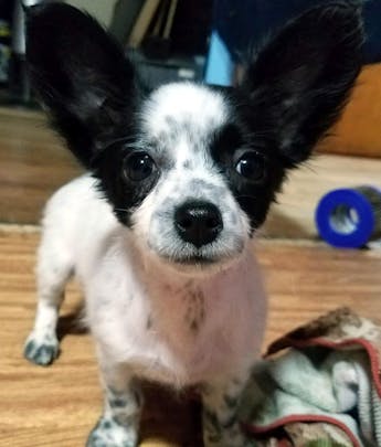 Chihuahua Papillion mix. LOOK AT THOSE EARS! That was the day we bought her home, and the second picture was taken about three years later.