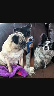 Pugsley(pug) is on our left, Walter(aussie shepherd mix) in the middle, and Eleven (Chihuahua/Papillion mix) on the right. This was a couple of years ago, Puggers is almost 16 now!