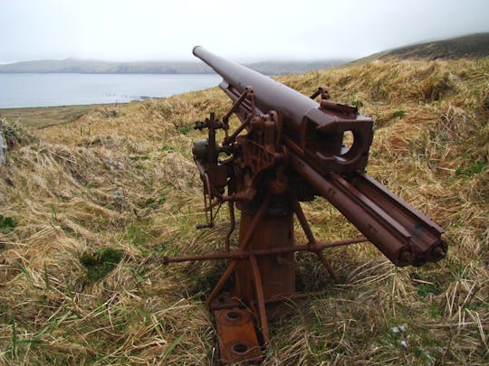 Aftermath of the Japanese invasion of Alaska: 75mm gun abandoned by their military on Kiska Island
