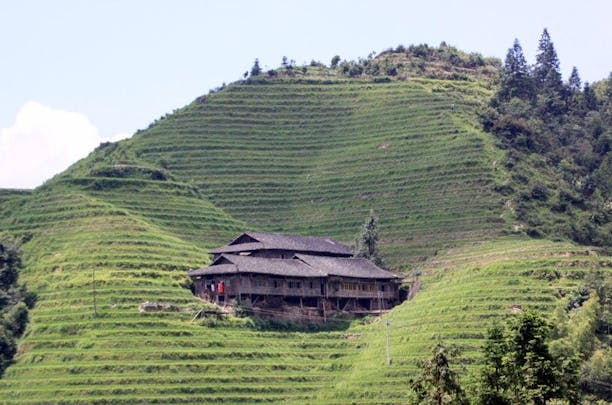 A farmhouse near the village of Huangluo, Longsheng. Village elders have a saying in Longsheng: where there is soil there is a terrace. Two hours ride from the city of Guilin in Guanxi province, the problem of growing rice on steep hills was long ago solved. From the Yuan Dynasty