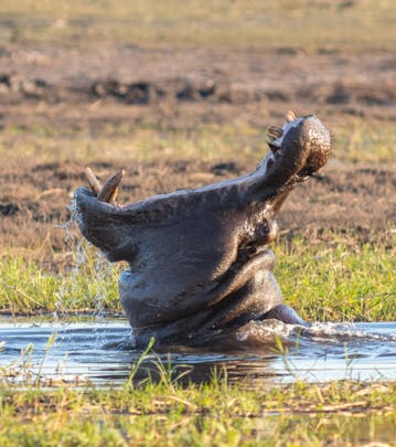 A hippo can open its jaws astonishingly wide - up to about 150 degrees. That's almost straight open - enough for plenty of food. However, in this case it is a display of dominance rather than hunger, boredom or tiredness. As such, it's pretty convincing. Picture by Diego Delso