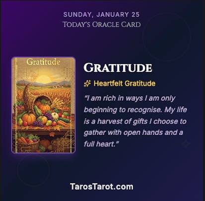 ✨ Today's Oracle Card: Gratitude "I am rich in ways I am only beginning to recognise. My life is a harvest of gifts I choose to gather with open hands and a full heart." You have been so focused on what is missing that you have forgotten to gather what is already ripe. Pause an