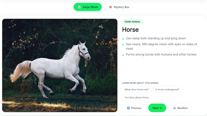 🐎 This horse fact shocked me today… Horses can sleep standing up AND lying down 😲They also have almost 360° vision and build strong bonds with humans. I discovered this using a fun Random Animal Generator with swipe mode — feels like scrolling TikTok but for learning 🧠✨ 👉