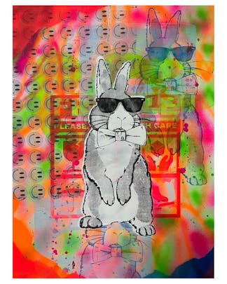 White Techno Bunny Print by Barrie J Davies, Unframed Silkscreen print on paper (hand finished), edition of 1/1 A2 size 42cm x 59cm.