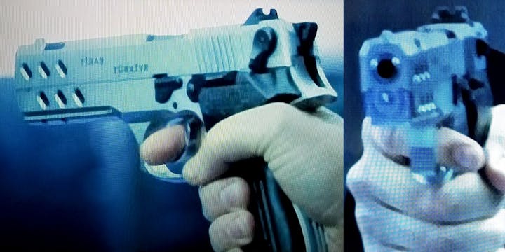 Spotted in an episode of the old Canadian sci-fi series "Continuum". ChatGPT says "You’re almost certainly looking at an EAA Titan / Tanfoglio Witness large-frame, dressed up a bit for TV." but I don't see the resemblance really. Any ideas?