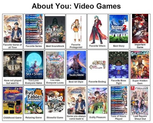 I took the About You: Video Games template going around the internet and filled it out - and added 3 rectangles I thought I really needed to express myself.