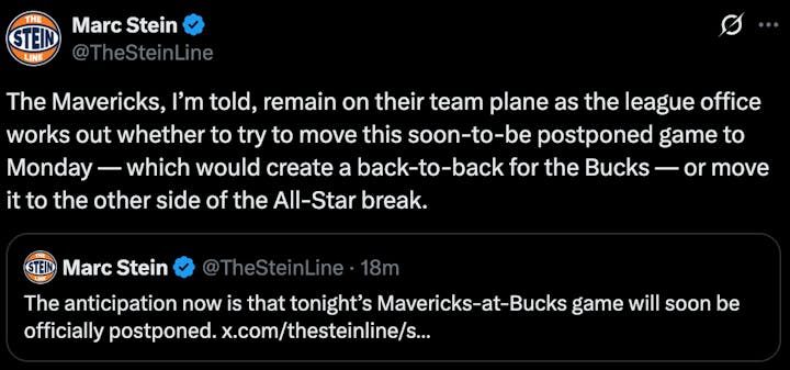 The NBA is still waiting to see if todays game against the Bucks can go ahead, per Stein. The Mavs are yet to leave Dallas.