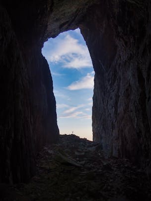 This is one of the two openings of the large hole through the mountain Torghatten. It's a quick hike up from the road just outside Brønnøysund, and as soon as the rocks stop falling down from the top of the cave after spring, it's perfectly safe to walk through it.