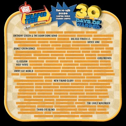 Artists are starting to register for Warped Tour, so far these are the artists listed in the lineup: Anthony Green & The Boom Done Band Big Ass Truck I.E. Bryce Vine Dance Gavin Dance Girlfriends Glassjaw Holy Wars Jimmy Eat World New Found Glory The Early November Thi