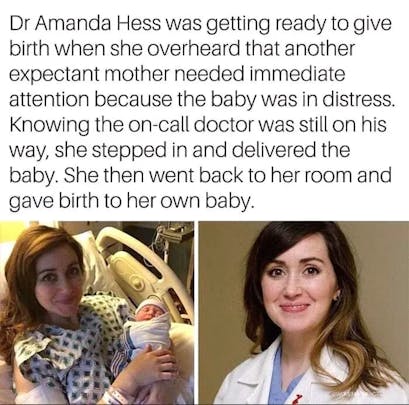 In labor herself, Dr. Amanda Hess delivered another baby in distress first, then gave birth to her own. True heroism has no limits. 💙