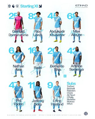 Man City Team vs United | Starting XI: Donnarumma, Lewis, Khusanov, Alleyne, Ake, Rodri, Bernardo (C), Semenyo, Foden, Doku, Haaland SUBS | Trafford, Bettinelli, Reijnders, Cherki, Ait-Nouri, O'Reilly, McAidoo, Mukasa, Mfuni
