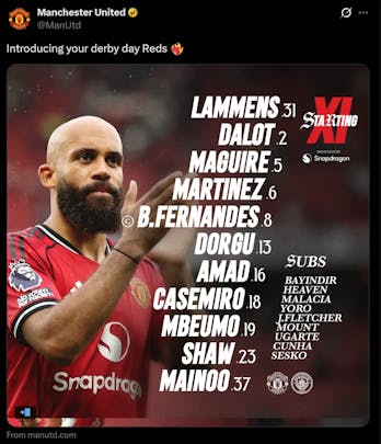 Manchester United Team vs Manchester City - English Premier League 17 January 2026 | Starting XI: Lammens, Dalot, Maguire, Martinez, Shaw, Casemiro, Mainoo, Fernandes, Dorgu, Amad, Mbeumo