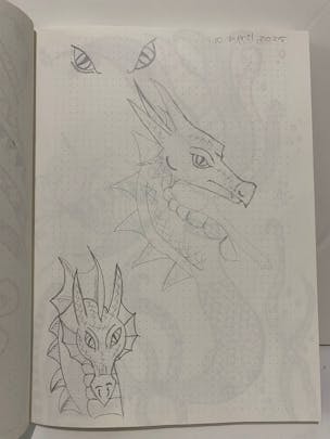 Practicing drawing dragons from the book 'Drawing Dragons: Learn How to Create Fantastic Fire-Breathing Dragons' by Sandra Staple