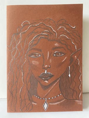 I drew this dark-skinned fairy on coloured paper, this is cardstock, just to push the toned-paper experience a notch further. I was curious about what else becomes possible when you go darker than standard toned paper.Next time I'll add black pen to see what else is possible.