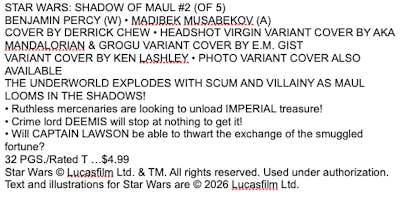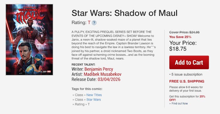 Two new issues from Marvel are due in April, including Shadow of Maul #2 (of 5) and Galaxy's Edge -- Echoes of the Empire #1 (of 5)