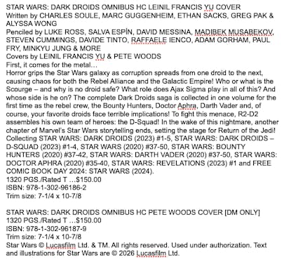 It collects Dark Droids 1-5, D-Squad 1-4, Star Wars (Vol. 3) 37-50, Darth Vader (Vol. 3) 37-50, Doctor Aphra (Vol. 2) 35-40, Revelations #1 and Free Comic Book Day 2024 #1