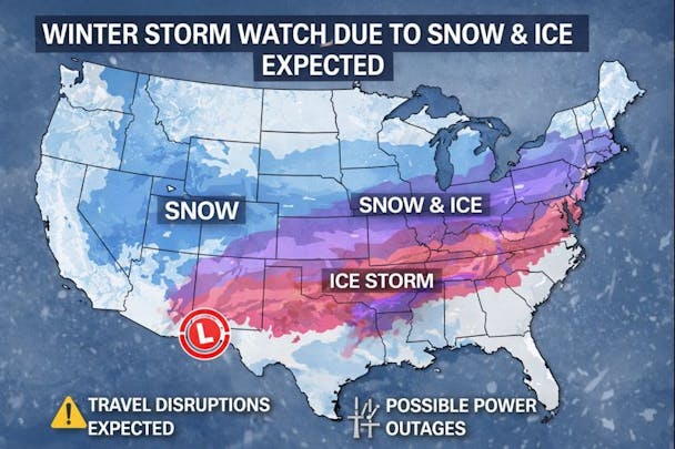A broad winter storm watch is expanding across the United States as a large, slow-moving system pushes east, bringing a dangerous mix of heavy snow, sleet, and freezing rain. Forecast models show a wide impact zone stretching from the southern Plains through the Midwest and into