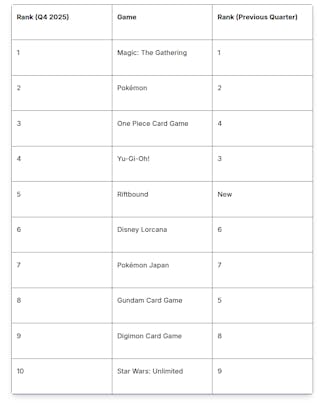 Riftbound landed at number 5 and One Piece overtook Yu-gi-oh for number 3 spot while Gundam slipped from number 5 -> 8