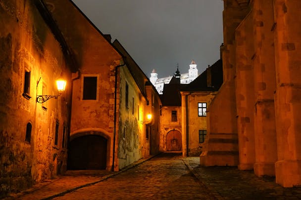I like wandering the quiet streets late at night, seeing them like this. And for a daytime excursion, you can head to a spot just outside the city where Slovakia, Austria and Hungary meet. If you are three people you can sit around a table while all being in different countries.